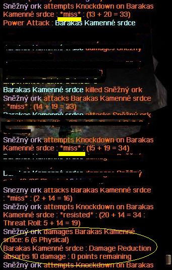 Šel jsem na tygra a protože mé vlastnosti nejsou tak dobré, mohl jsem výpis pozorovat. Jednou mě zasáhl běžným útokem, ve výpisu se objevil regulérní zápis o pohlcení zranění a zbývajících bodů pohlcení kouzla (ještě dosti vysokém). Boj pokračoval dále ve stylu, že tygr se snažil zasáhnout srážením a VŽDY minul. Po pár kolech se konečně rozhoupal a zkusil normální útok. Nestihl jsem se divit, když jsem viděl, že mě už zranil.