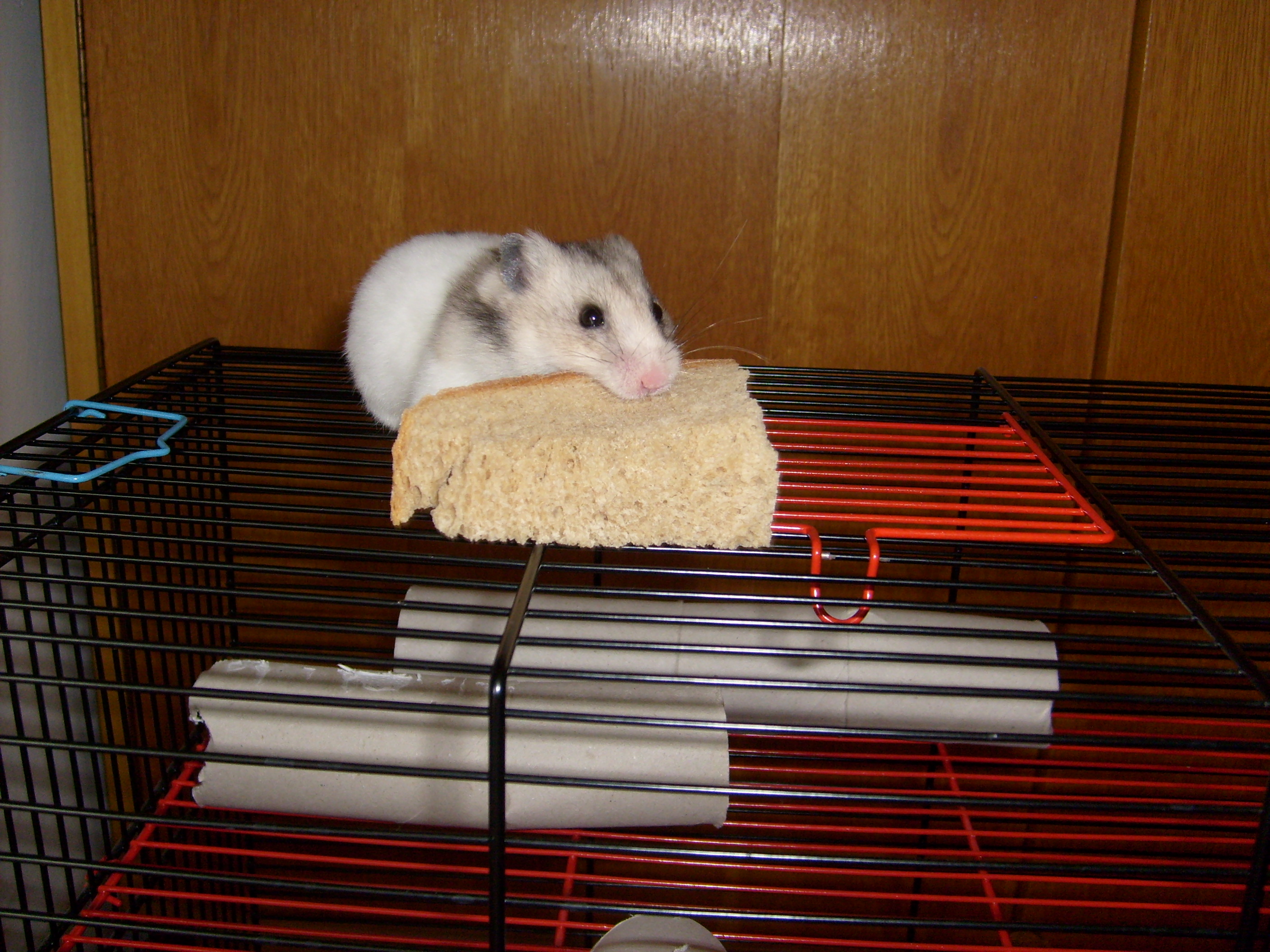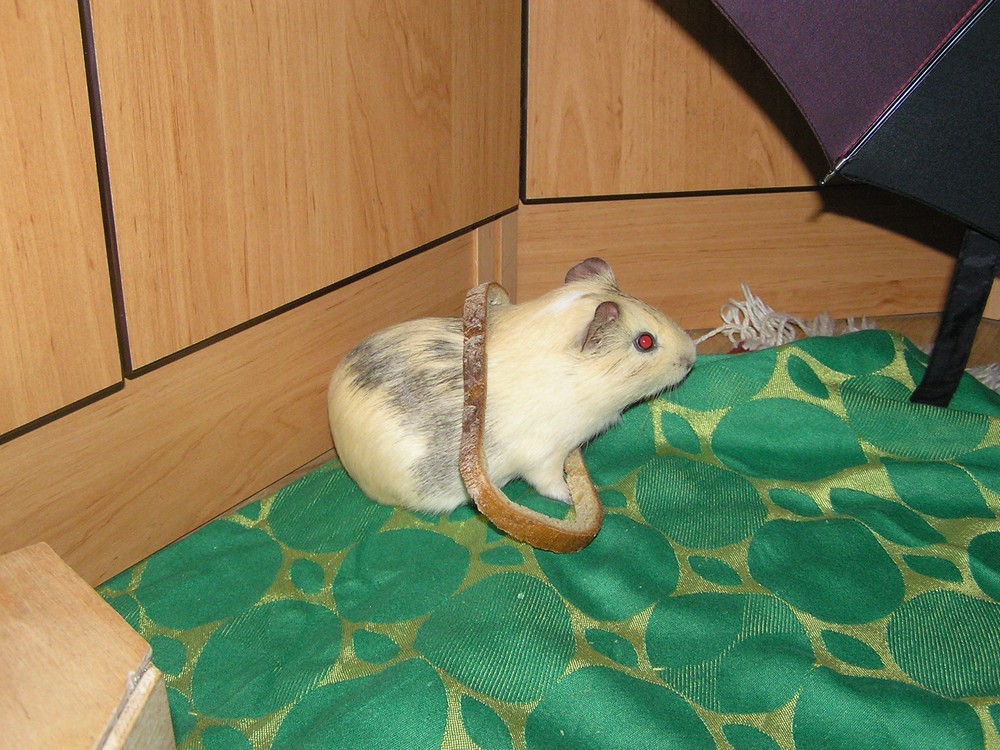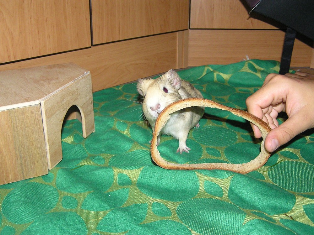 Nepřítel číslo 1: Mříže! Každý den se jim musí ukázat kdo je tu pán. Oblíbené jídlo: zápasy o ukousnutí z vitamínových tyčinkek visící v kleci, pokus o přesun trvdého chleba do domečku, oříšky či mandle Epická obratnost: Viset na zadních a koukat na nepřítele vzhůru nohama není problém. Zaměření na zbraň: zuby Práce: Pomáhá při craftu přebíháním přes klávesnici Spaní 20hodin denně, špičkové schovávání a nejlepší úkryt v rukávech svetru, všechno jídlo v dosahu musí být přemístěno do domečku(pomocí obrovských kapes). Má ráda teplo a chvilkové pomazlení s vybranými a oddanými posluhovači. Nesnáší hluk a úzké rukávy. Poznávací znamení : černé korálkové oči a heboučký šedivo bílý kožíšek.