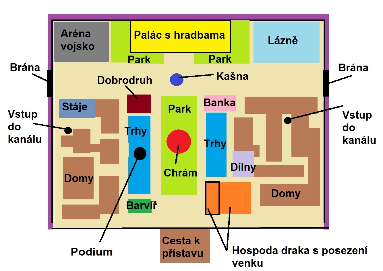 , což by za normálních okolností byla poklona, ale tady mi opravdu chybí ten prvek chaosu. Z mého pohledu by mezi branami a přístavem měl vzniknout volný prostor ve tvaru T. Posetý všemožnými věcmi. Je to prostor, který prostě nejde zastavět, protože se v něm každoročně konají obrovské trhy v době, kdy všechny řeky, kromě Marciku vyschnou, a město zaplaví kočovníci. Přímka mezi branami a přístavem, by se tedy stala logickým "náměstím". Mohla by tu být pěkná všehochuť - studny, tábořiště, venkovní stáje plné podivných tvorů, trhy otroků, další venkovní tržní stánky, pranýře, popraviště, malé parky.