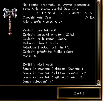 slencak wrote: ...... Ano to je teď vcelku nová chyba očarování. Nejspíš ta chyba, co mi pokazila můj meč. Zkoušel sem očarování a dal sem 120% elektřinu na katanu. Měl sem tu samou chybu jako ty, ktana měla +1 zranění elektřinou a +1k4 zranění elektřinou. Nevím čím by to mohlo být, ale nejspíše je tam chyba v nastavování poměrů. Páč sem předtím vyráběl katanu s poměrem 100% a 20%, ted už nevím co, asi kyselina a poprava nemrtvých. Pak sem nastavil vedlejší elektřinu a hlavní elektřinu a dal poměr 120%. Pak ta vytvořená katana udělala tu chybu viz výše. Takže sice sem nastavil 120%, ale přišlo mi to jako by to pořád bralo 100+20. Možná to chce nějak omrknout prosím Nomisi.  Ale ještě tuhle chybu chcu jednou otestovat, ale potřebuju vyšší skill no