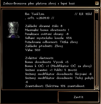 180/20 (železo bronz, lepší kůže) +1ac, +2ac bodaní, +1 výcvik, pohlcení +1/5 - 11lvl