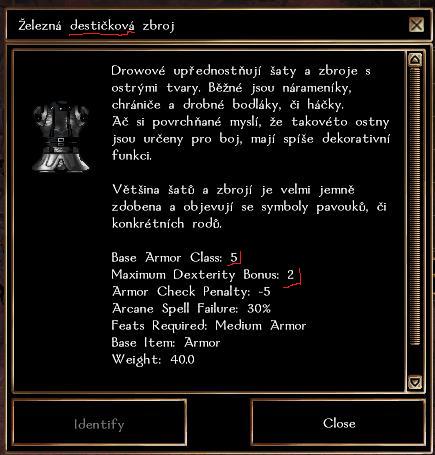 Davám sem k porovnání dvě zbroje, obě destičkové. Nejsem si jistý zdali jde o chybu nebo jsem zase jen něco přehlédnul, jak je mím dobrým zvykem  . Železná destičková zbroj: Base Armor Class: 5, Maximum Dexterity Bonus: 2; (ke koupi u NPC obchodnika) Admantito-Mithrilová destičková zbroj s mistrovskou kůží: Base Armor Class: 6, Maximum Dexterity Bonus: 1; (kraftová výroba) At se dívám jak se dívám, tak kraftová destičková zbroj se v základu tváří spiše jako pancíř.