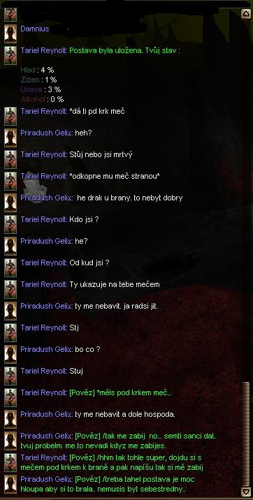 innfra wrote: Omg tak jsem tam kecal se zachym po telu a nemusí každej vědět o čem jsme si psali... Děkuju že máš o to takový zajem  co proti tomu máš... jo vlastně to že jsem zabil esuli a je mi to líto, ale z hlediska příběhu se to muselo stát. Zřejmě narážel na podobný incident (Topic Bumovo "RP"), kde se mi dostalo pomalu pranýřování za to, že jsem začernil telly.  A když už jsme u toho: V mém případě: Bum ignoroval moje hraní, dál si mlel svoje. Naštval jsem se a dal to na forum. Výsledek: Já přeháním, dávám na forum každou blbost a ještě je podporuju cenzurovanými screeny. V tomto případě: Skaars ignoroval Innfrovo hraní a odešel. Innfra se naštval a dal to na forum. Výsledek: Pokud by se to opakovalo, následuje permanentní smrt.