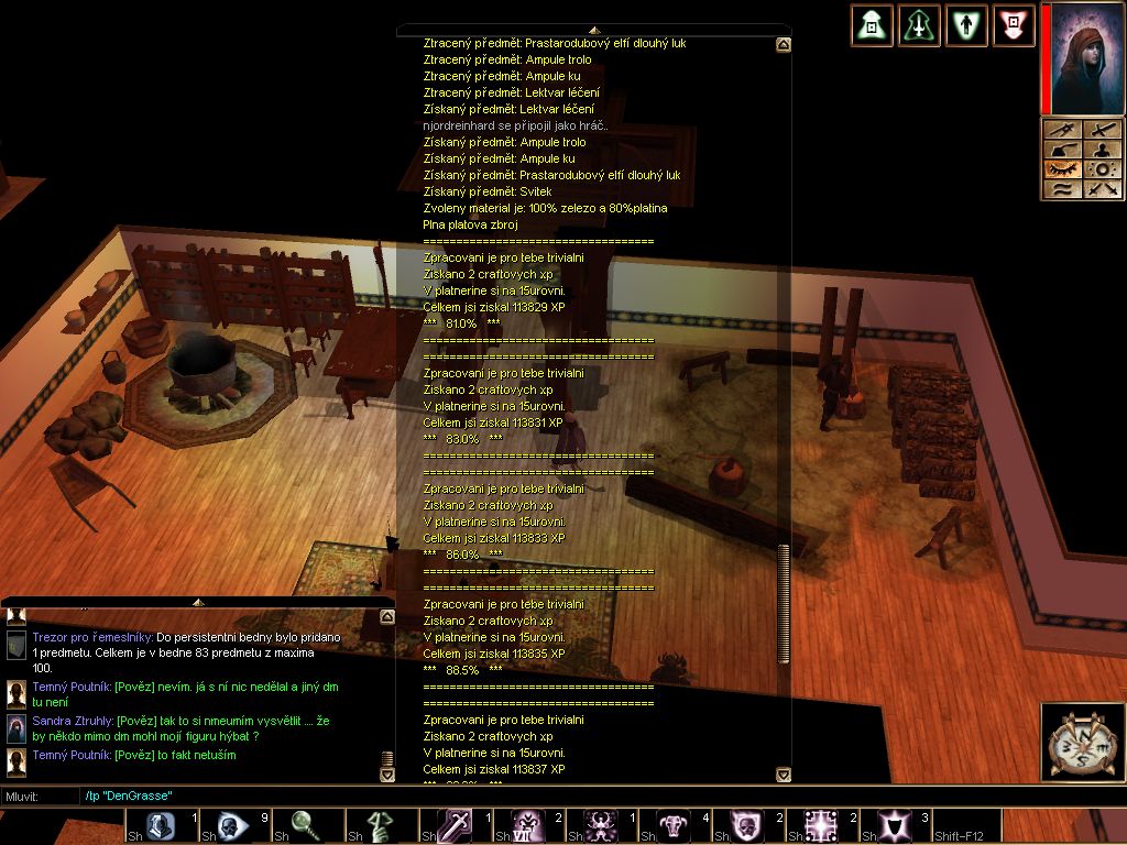 Sandra pracovala u kovadliny, když mne náhle přepadla potřeba urychleně navštívít WC. Po návratu odlehčen jsem s hrůzou zjistil, že mi někdo manipuloval postavou - přesunul ji na jiné pracoviště a snažil se tam vyrábět, a vybíral předměty z inventáře a po prohlídnutí je zase vracel - přes kanál PJ jsem se dotázal, zda to dělá DM, ale jediný přihlášený DM tvrdil, že to nedělá a že jiný přihlášený není. Pokud s cizí postavou může manipulovat nějaký hráč, je to hrůza !!! V příloze screeny.