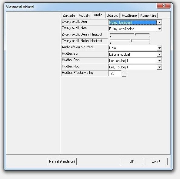 5) Hudba den / noc - Zde je možno nastavit hudbu, která bude hrát v lokaci. V některých lokacích se ani nemusí nastavovat, pokud chcete např. navodit mrtvou atmosféru nebo naprosté ticho.