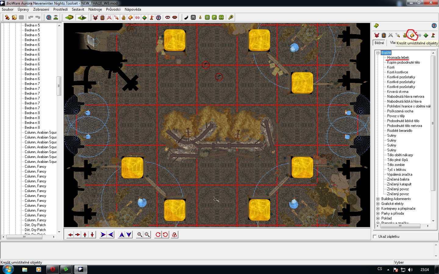 Klikneme na placeabl v levém seznamu pravým myšítkem a vybereme "Uprav oblast". Otevře se nám okno s pozicemi x, y, z. Pomocí změny hodnot v okýnkách můžeme s placeablem manipolovat. Např. jej můžeme ponořit do země nebo vyzdvihnout vzhůru.