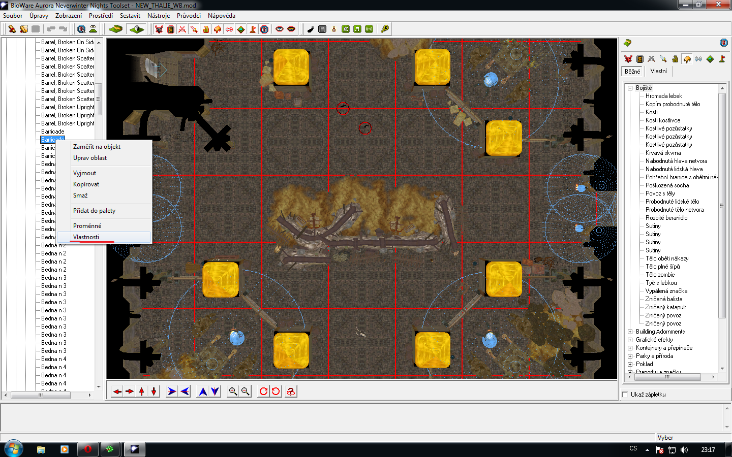 Klikneme na placeabl v levém seznamu pravým myšítkem a vybereme "vlastnosti.Otevřou se nám vlastnosti daného placeablu a můžeme pracovat s jednotlivými záložkami.