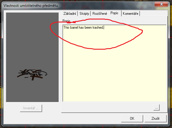3) Má inventář - Pokud zaškrtnete, placeabl bude mít inventář. U nezamčených kontejnerů se nastavuje ještě zápletka, aby nešly rozbít. Pozor! U kontejnerů v přátelských oblastech, které mají fungovat jako kontejner, je třeba smazat všechny skripty.
