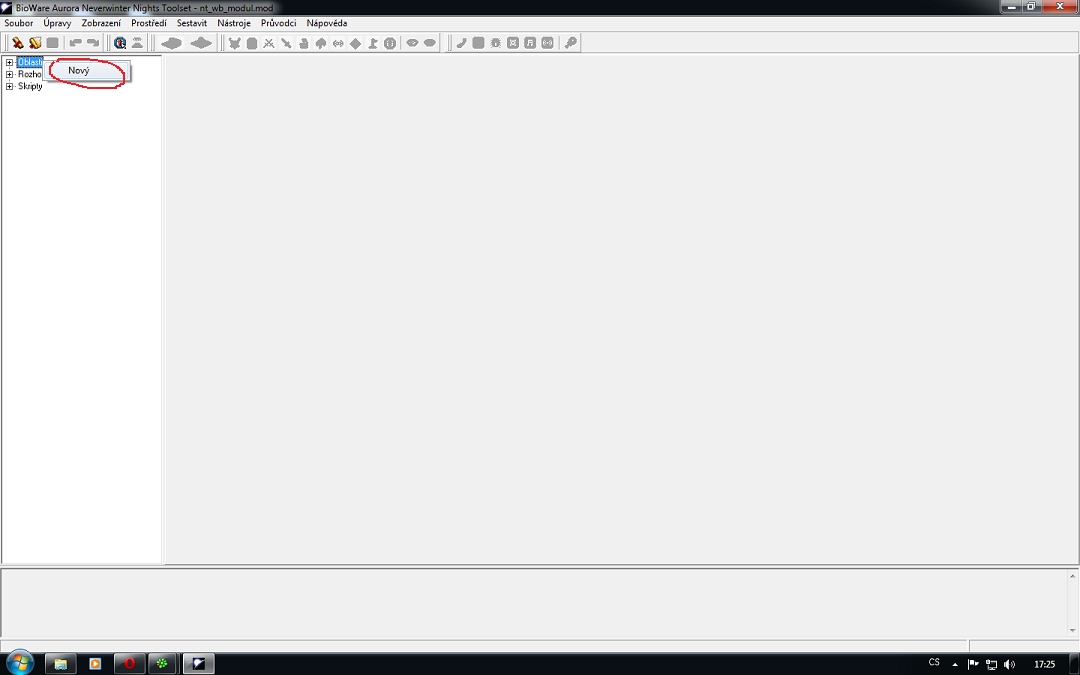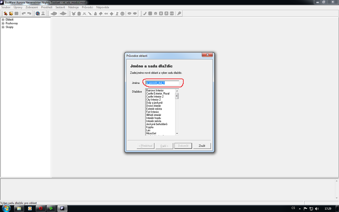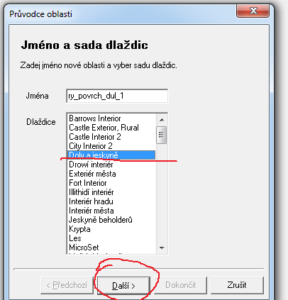Vytvoření nové lokace 1) Kliknete pravým myšítkem na "Oblasti" a poté levým myšítkem na "Nový". 2) Otevře se vám okno, kde zvolíte název lokace. Napište do okýnka název. Je důležité, abyste jej naspali heslovitě ve stylu "ry_...", kde první část názvu je váš prefix (já mám např. "ry_" jako Rejty, nestane se pak, že se budou dvě lokace jmenovat stejně), další část tvoří nějaké označení lokace. 3) Poté zvolíte tileset, ve kterém chcete lokaci vytvářet. Tileset určuje prostředí a možnosti pro vaši tvorbu (např. les, hory, sněhové hory atd.). Poté klikněte na "Další". 4) Dále zvolíte velikost lokace. Pro exteriérové lokace je standardní velikost 30x15 nebo 15x30 (např. pro exteriér lesa), pro lokace dungeonů je standardní velikost 15x15. Poté kliknete na "Další". 4) Nakonec kliknete na "Dokončit".