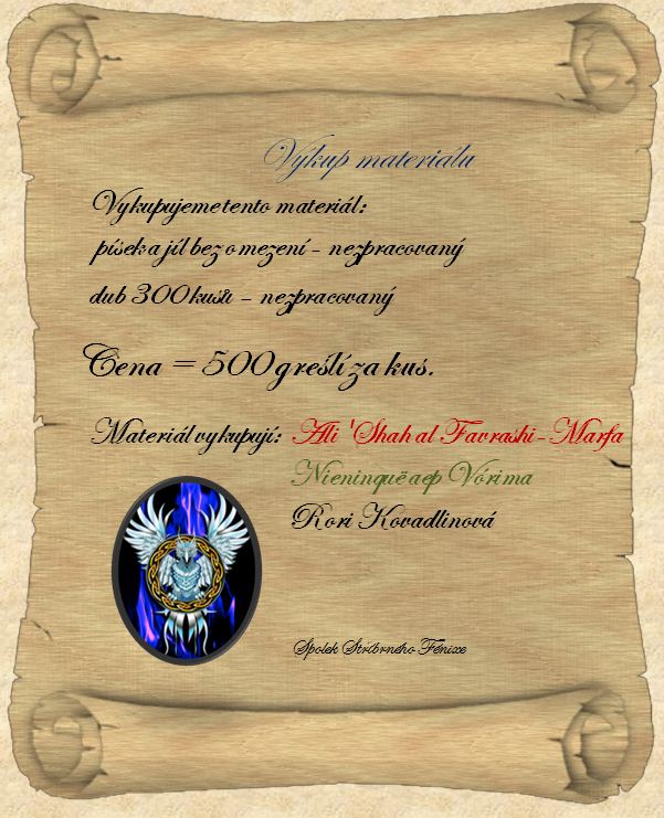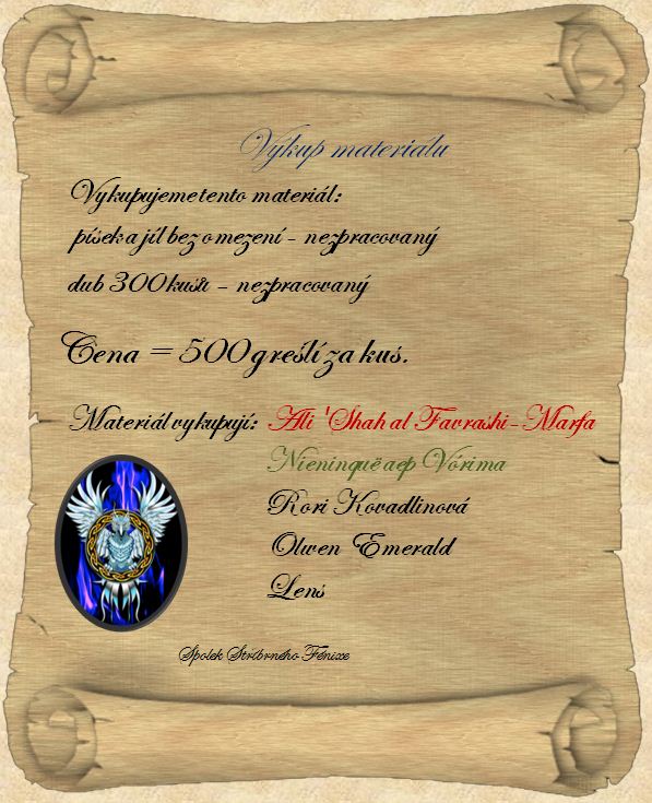 Sháním pracovníky pro získávání materiálů. Jedná se především o dřevo, menší množství železa a případně jíl, či žulový kámen. Zájemci nechť vyhledají mě, anebo Rori Kovadlinovou pro přesnější informace.