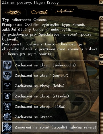 Ahoj, na trpasličí sekeru (rodovou zbraň) nejde vzít zaměření na zbra%n (počítám, že stejný problém bude i s se specializací a rozšířeným kritickým zásahem). acc: Glumisek postava: Durman Zlomocný (duergar)