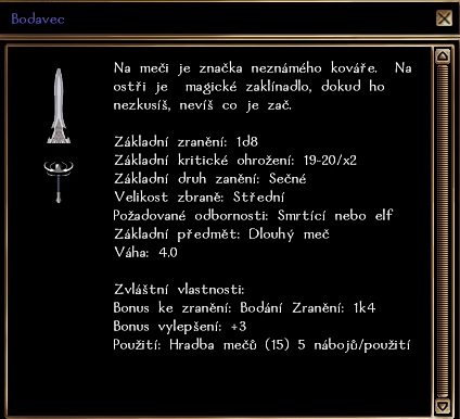 Koupil jsem si meč Bodavec, a byl nenabitej. Tak jsem ho šel nabít a zaplatil za to 50k a rázem stouplo IRL z nevímkolika (ale méně než 21) až na 25. Tudíž se zbraň stala nepoužitelnou. Je to docela klamavá reklama, protože zbraň si teď můžu vystavit na krbu |