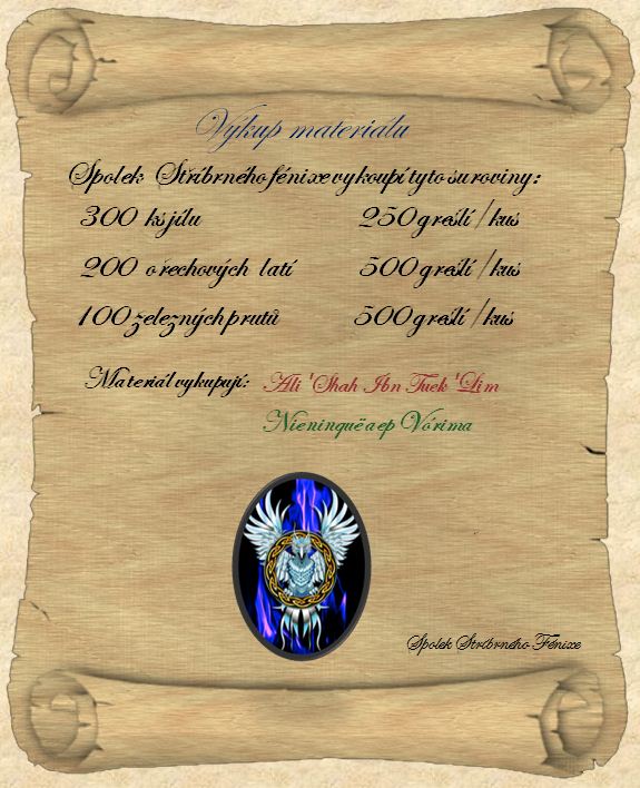 Sháním pracovníky pro získávání materiálů. Jedná se především o dřevo, menší množství železa a případně jíl, či žulový kámen. Zájemci nechť vyhledají mě, anebo Rori Kovadlinovou pro přesnější informace.