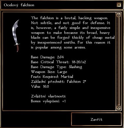 Problém je ten, že první falchion funguje v pohodě, počítají se mi featy (zaměření, feat z WM a vylepšený kritický), ale u té obouruční šavle nic. Přitom ta obouruční šavle je taky v popisu označená jako Falchion.