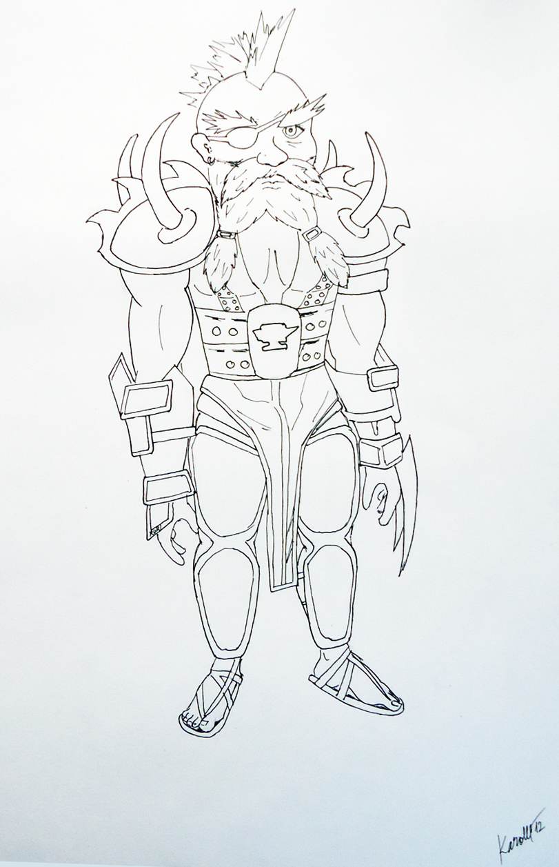 Trpaslík měřící 4,2 stopy, vážící určitě něco přes 150 liber. Ten kdo ho jednou uvidí určitě si ho zapamatuje. Už z dálky se nedá přehlédnout jeho červený kokrhel, který pro něj má stejný význam jako fous. Jedno oko mu překrývá klapka, sem tam řekne jak k tomu přišel, ale velice nerad. Druhé oko má hnědou barvu, která vyzařuje přátelství a důvěru. Konec fousu má rozdělený sponkami na dva copy. Je velice hrdý na svoje zlatem zdobené pláty. Na náramenících má několik zubů z nějaké příšery. Paže má volné, to mu dovoluje dát sem tam pořádnou ránu. Nenosí štít, místo toho má na levačce přidělané dvě čepele, které umí dobře použít. Na zádech má připnutou svoji jednoručku. Od pasu dolu neni moc obrněný. Rád nosí připnutý kus kožešiny kolem pasu, která se ke kolenům zužuje. Na stehnech a na lýtkách má jen chrániče. Zapáchá potem, ale jakmile mu někdo řekne, že už moc smrdí, vykoupe se.