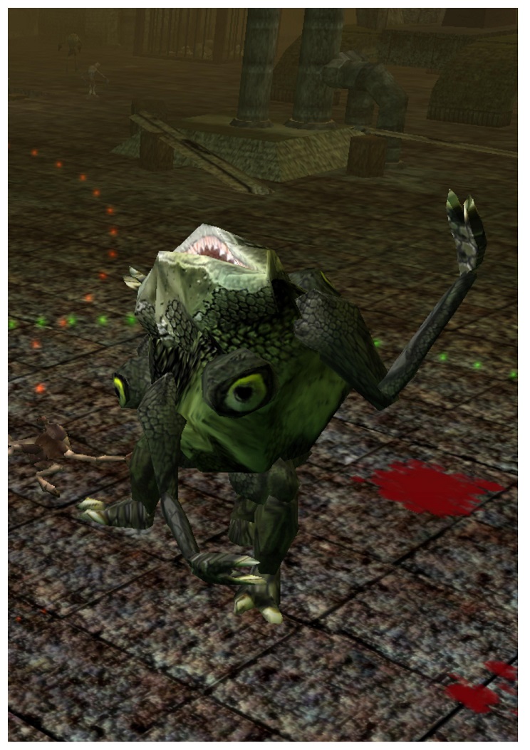 Kamenná hrobka je stejně jako mnoho dalších temné místo samo o sobě, avšak je ještě navíc prosyceno temnou magií. Hrobka se nachází hluboko za smrdutými tunely. Z hlubin se ozývají táhlé a nervi drásající zvuky. Nepodařilo se mi zjistit, co v kamenné hrobce bylo původně uloženo k věčnému spánku a ani kdy a k jakému účelu byla původně vystavena. Je možné, že je místo využíváno k uložení nepohodlných svědků a narušitelů z blízkého obydleného jeskynního systému. Každopádně, současnými vlastníky hrobky jsou ghůlové a smečka jiných nižších nemrtvých. Postupným průchodem do nižších pater hrobky jsem stále očekával, že tyto nemrtvé musí mít pod palcem minimálně silný faern, který si svou snahou uchovat pevné zdraví prodělal přerod v licha. Mé obavy se naštěstí nevyplnily, či spíše možná již někdo přede mnou hrobku vyplenil a to, co se v ní objevuje je již jen malý pozůstatek dřívější slávy. Každopádně jsem tu narazil na strážce podlaží. Jedná se sáh vysokého bojovníka, pokrytého obvazy, od hlavy až k patě, tělo má přepásáno kovovými popruhy a výztuhami. To ale není přesně ta věc, na kterou by se měl jeho oponent soustředit. Tou pravou věcí je obří magická kosa, kterou se strážce podlaží dokáže velmi obratně ohánět. Vítěz nad strážcem by hlavně neměl zapomenout amputovat prst mrtvé mrtvoly nemrtvého a přinést vetešníkovi. Jedná se o velmi žádanou magickou ingredienci vážící 0,3 lb, za kterou vyplatí vetešník 8 měšců zlata.