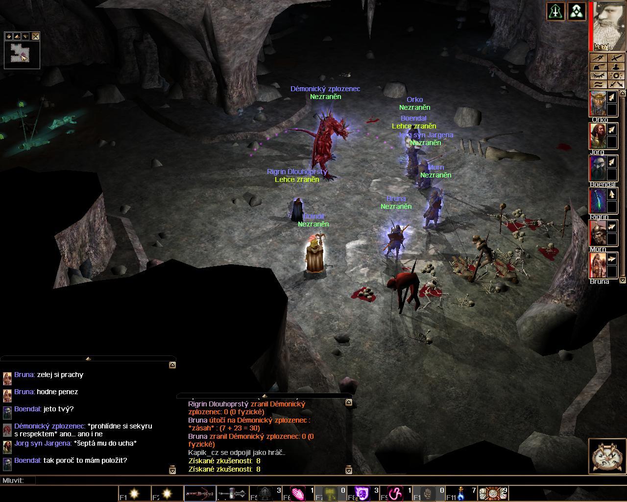 Takové sůstředění duševní síly sem nezažíl hani doma v chrámu vod runových knězů, zasáhlo nás to jak vlna pobřeží ha dóbro nám z teho nebylo. Podařilo se mi jednoduchó meditací zaštítit naši mysl ha ve chvíli kdy sem zkončil se zaříkáváním už zpívala Boendálova Beci smrtelnó písničku. Na mě vostalo uderžet mu vod těla vokovaný mozkodlaby ha to taky nebyla žádná sranda. Stál sem tam jak vrostlé do země ha vodrážel tvrdý útoky, že bych jim něco vrátil ha nebo je dokonce zabíl nemohla bét řeč. Jak Boendál skončil s těma mystikama měli to vokovanci spočítaný, jadna rána za kerk ha váleli sa ve vlastní kervi. Vzhledem k vývoju situace nebylo na co čekát ha poprosíl sem Norda haby shlédl na svý nehodný děcka ha posílil nás božskó přízní. V další místnosti to už šlo jak po másle a než sa ty potvory rozkókaly měli to za sebó. Tam sme taky našli pervní nešťastníky. Boli zavřený v nějakých strojích, vylomil sem zámky na dveřách ha postil ty nebožáky ven, jen je divný že kůkali jak by jim včely huletěly, ále k východu se hernuli tak co. Tak sme postupovali dál a póštěli ty nebožáky dom, měl sem porát pocit jako by mě něco šimrálo v kebuli ha jak sem se chcel jednůc poškrábat málem sem si mečem propíchl hlavu, hale jinak zaštítění bylo pevný jak víra v Norda. Když sme všecko prozkůmali vostali nevotevřený jen jedny dveře, za těma to tak nějak zvláštno bzučálo, vopaterně sem je povotevřél ha uviděl hlavního mystika jak zaříkává, musel vo nás celó dobu věděl prevít, tak sem dveře fofr přirazíl ha začal sa chystat na melu. Attachment: