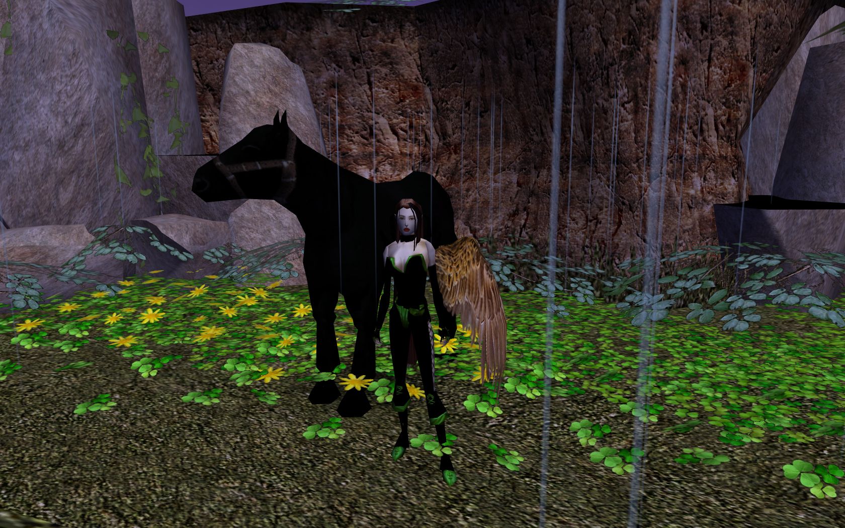 Z ivory rovnou do Karathy.Do stájí akorát dovezli mladého hřebce z Isalský pevnosti.All je mlčky pozorovala.Hřebec to byl krásný a statný.Jen potřeboval pevnou ruku , jak tak sledovala.Sledovala hřebcův krok , jakoby snad znala o koních vše.Avšak sama si na nic nevzpomněla.Bezzvládní vojáci , maštalíř i kovář ho naháněli , ale hřebec se dále vzpínal a vyhazoval.To už Alleye nedalo , týrat takové krásně zvíře.Vystoupila ze stínu stromu a přišla k nim.Bylo sice těžké dorozumět se s nimi, když nevydala jedinou hlásku.Pro Alleyi i hřebcovo štěstí se však dohodli.All předala peníze a koupila rovnou sedlo i otěže.All k němu opatrně přišla.Hřebec hrabal kopytem s rousy a z nozder mu šel lehký obláček páry.Černé oči nebyli skrz dlouhou kštici skoro ani vidět.Natáhla k nemu ruku - zůstal stát a tak ho pohladila a dýcla mu do nozder.Z nezkrotnýho dábla se stal poslušný beránek.Moc dlouhou nečekala a raději ho postrojila hned.Do sedla ještě vyrila HRAVAN -RAUCO.Což znamená v elfštině divoký ďábel. Vyvedla ho z ohrady , vyhoupla se do sedla.Zamlaskala a přitáhla si otěže k sobě.Hravan - rauco se vzepřel a na lehkou pobídku vyrazil k pobřeží.Jedno tělo , jedna duše.