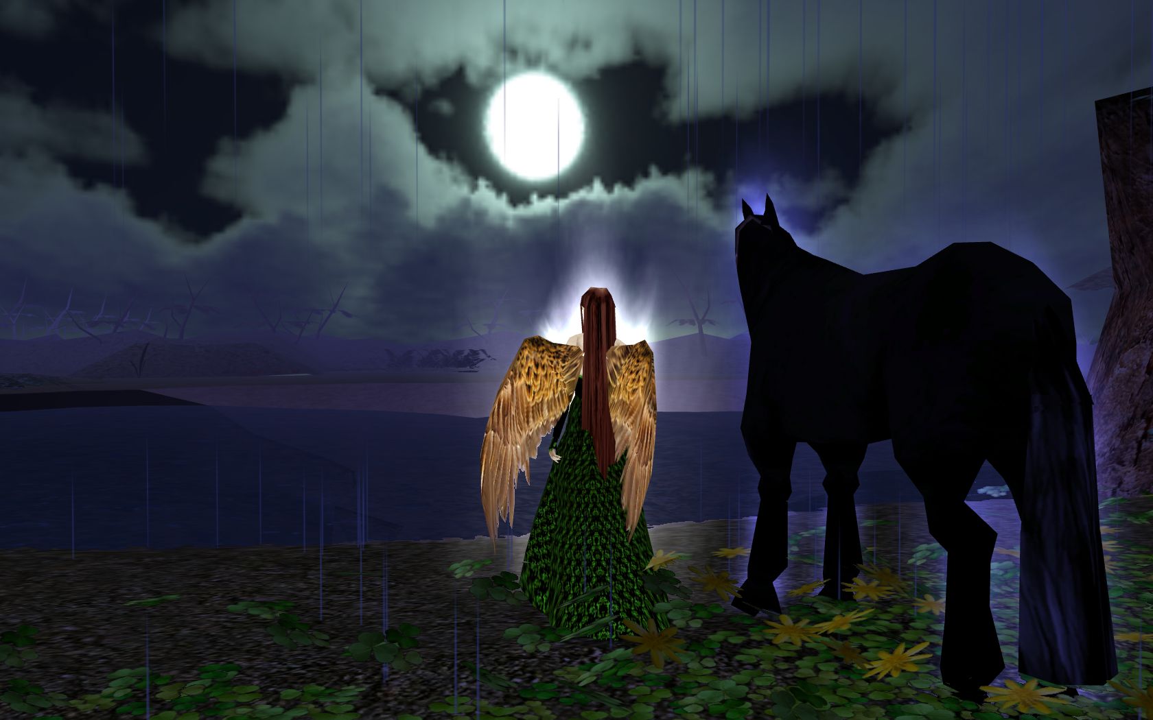 Alleya a Hravan - Rauco se projížděli noční krajinou v okoli Karathy když All uslyšela křičet někoho o pomoc.Pobídla teda Hravana - Rauca do cvalu až dojela ke Karathskému lesíku.Rozhlížela se , ale nikde nic neviděla.Sesedla z hřebce a pokračovala jen v lehkých jezdeckých šatech.V ruce luk , nazádech toulec a štít u opasku se jí pak houpal kord.Zbytek věci nechala na svém milovaném hřebci.