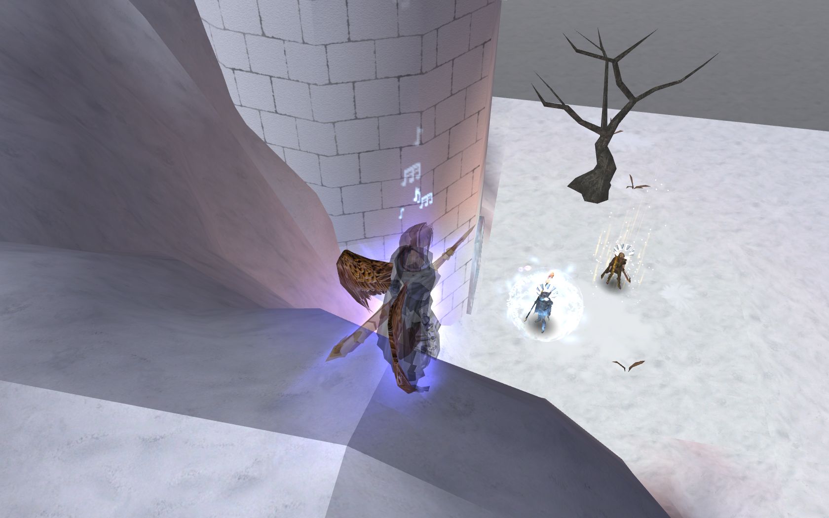 V horách krása , ten vzduch mmm cítila se volná.Vylezla na nejvyšší kopec a rozlížela.UViděla medvěda a tak neváhala.Ovšem někdo se tam připletl , přestala střílet , medvěd ho pak napadl tak začala na novo.Zas se tam někdo připlet.All nechápala a tak zas přestala.Nějakou dobu byl klid.Přešla poomalu na druhou stranu , blíže k věžičce.Uviděla dvě postavy.Jedna vypadala jako mág.Vyhrožoval , že jestli nepudje dolů , že jí chytne.All se jen zvonivě zasmála a schovala se do stínu a sledovala je.Chvilku asi o něčem dole mluvili a pak vešli do věže.All věž nezajímala , líbil se jí ten krásný vzduch.Seběhla dolů a šla okolo věže dál.Tam potkala onoho poraněného mědvěda.Nechtěla ho však trápit a tak vystřelila poslední šíp.Pak si k medvědovina chvilku lehla , aby nebyl sám zrovna když umíra.Bylo jí ho líto , ale zákon přírody.Stejnak byl nějakej nemocnej.Procházela se a s úsměvem sledovala jak z jejích úst vychází obláčky páry.Dokonce pod nějakým kopcem byli sněžní orci.All však neměla náladu se s nimi zahazovat a tak se pomalu vydala nazpět.Jennžé uviděla vééélkýho golema.Zahnal jí do slepé uličky a řekl ,že s ní chce mluvit jeho pán.All souhlasila, že s ním do věže půjde.Ovšem nebyla hloupá , a tak když golem zalez do jeskyně ztočila to zase domů.Za chvilku měla golema v patách , dala se do běhu.Ani Sawas jí neuchránil před golemem a když jí chytil za křídlo nemělo cenu , dělat další podfuky.Chtěl jí něco ukázat a tak teď doopravdy šla.