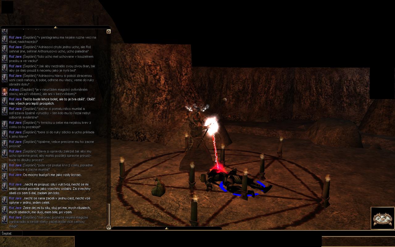 Krynské hory - Soutěska ledu - Obřadní jeskyně ..někde pod ledovou krustou v zemi. Vyhloubene doupe knezky, hlidana svymi poskoky. ..vsude mrtva tela, krvave stopy zanechane. Pentagram cervenou barvou namalovan, svicky jej doplnuji, ..telo knezky lezic uprostred nej. Pusobi to tak chladne, krev na zemi pomalu zamrza, ..na tele se vytvari ledova krusta, srdci dosel dech.