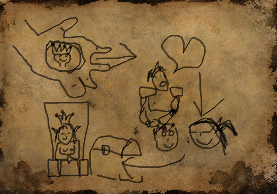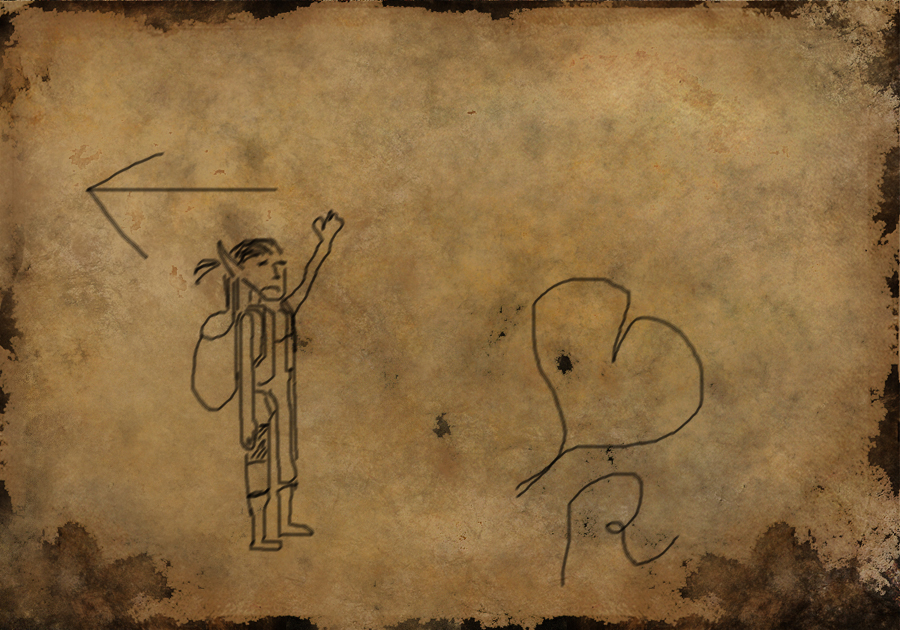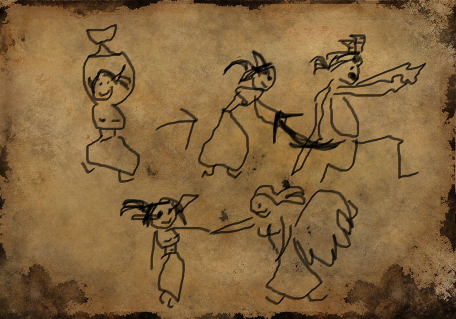 Dnes Rafael strážný pěkně prohnal. U cedule se zdržela déle, protože brala více zpráv z nástěnky aby měla na co kreslit. Když se mu konečně stratila v uličkách, zaběhla ještě do dílen a nasbírala u kovářské výhně nějaké uhlíky. Cestou dom, vesele poskakovala, z brašničky jí koukaly červené látky a ještě ten večer se na vnitřní straně její chýše objevily další dva výkresy. Attachment: