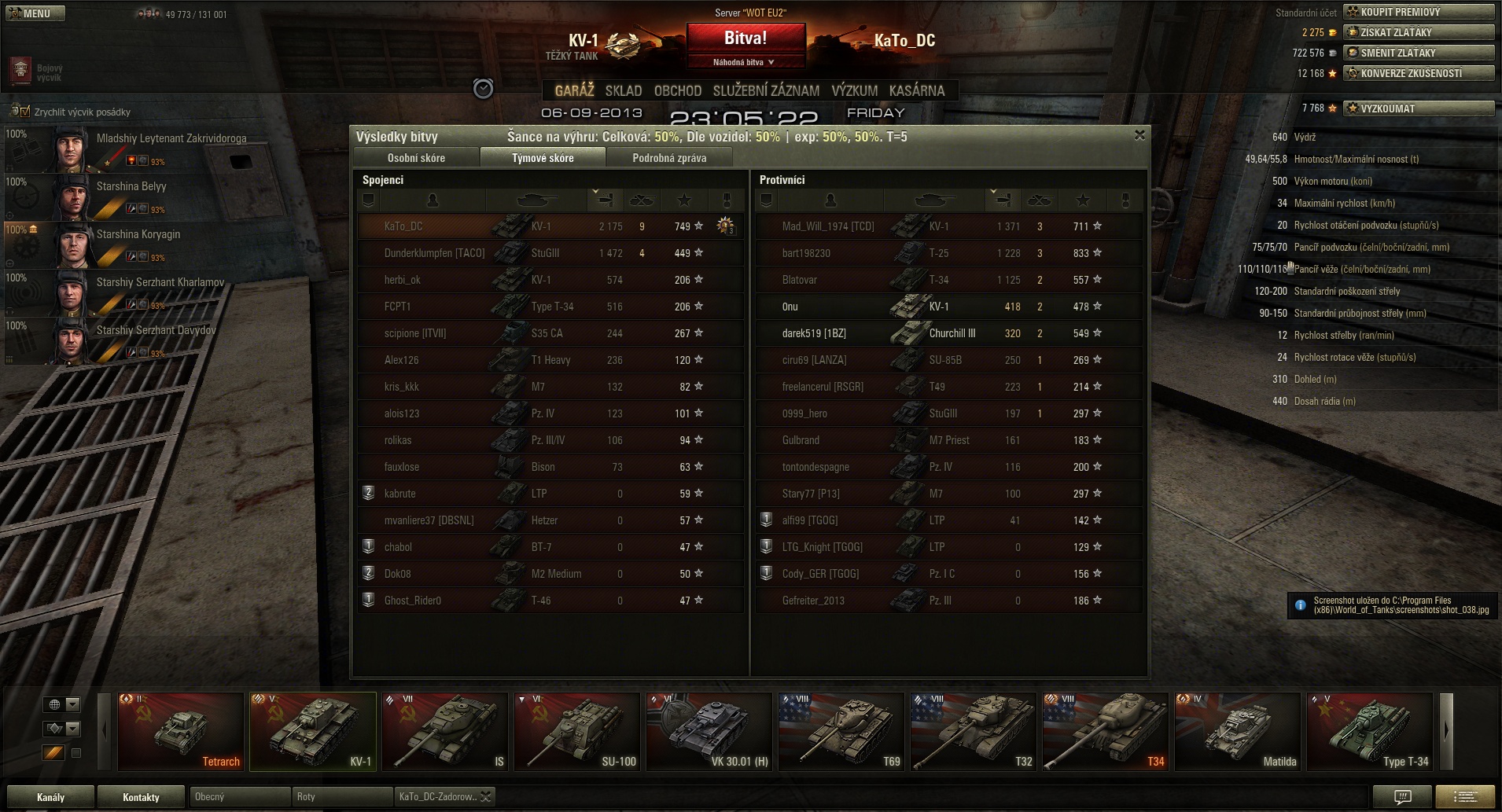 Když dostanete do týmu partu lemingů, nepomůže vám s KV ani svěcená voda a 10 zlatých nábojů (jinak ten Stug byl na hrotu "druhého" útoku, já se z cca třetiny mapy musel vrátit bránit bázi, bo mi útočný klín jednak ujel  a jednak se na obranu báze všichni vykašlali a začali ji obsazovat dva meďáci), ale bohužel když ke mě přijel nepoškozený  Churchill III s naklovanou KV, tak jsem si jen jednou cinknul do Churchila a pak definitivně shořel  pod jejich soustřelem: Attachment: