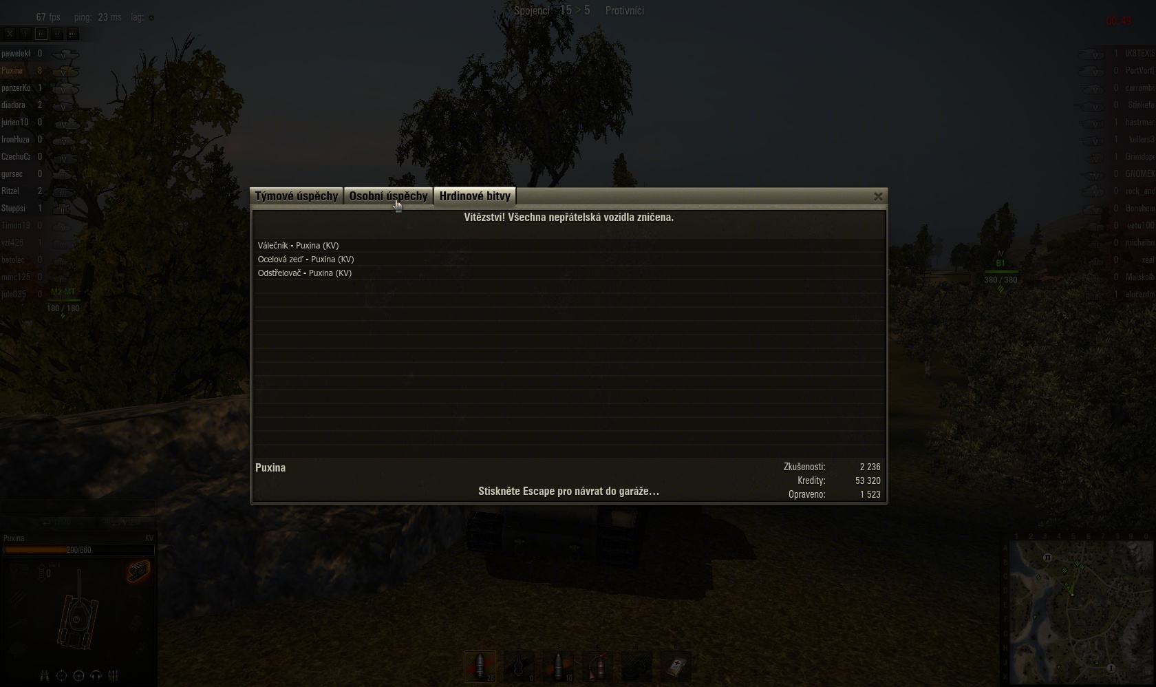 Bahnak wrote: Nemám potřebu za každou cenu dosáhnout po měsících nudného hraní na VIII. či IX. třídu a pak několik dalších měsíců šetřit na jejich výbavu. Chci se bavit a neplatit, tudíž hrajeme touto variantou a jsme spokojení. Jinak pokud jsou ve hře I. a II. třídy tak je na výběr ze 4 map, pokud II. a III. třídy tak je těch map asi 15 (přesně netuším), takže to neomrzí... No mě se třeba nejlíp vydělává s 4. a 5. třídou. Jezdím s T49, KV a občas dám SU-85B a většinou vydělám těch 10-30k A dostat se k tanku vysoké třídy je sice těžké, ale jde to, chce to jen najít styl, co ti vyhovuje. Já třeba hrál střední tanky a moc mi to s něma nešlo. Rozjel jsem stíhače (tank destroyery) a hned se mi začal navyšovat počet killů. Ted to střídám s těžkýma tankama a vím že těžké tanky a stíhači budou asi moje nej. A když se vyhrabeš na vysokou úroveň, tak to stojí za to  . Je krása když ted hraju IS-3 a nebo IS-4. To jen jedeš a slyšíš jak se ty střely odráží  . Nedávno jsem dostal 22 zásahů od těžkých tanků a pořád ten tank byl schopný provozu. Ale jak pořád píše Johnny, TS je nutnost. A když jsi s někým v četě, tak to jde hezky  .