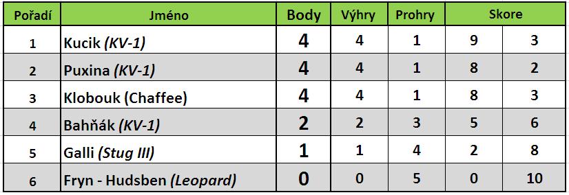 Přináším slibované výsledky.  5. úrovně tanků. Vítězem se nakonec stal kucik. Je to hezky vyrovnané, rozhodovalo nakonec skore, takže nebylo potřeba přihlédnout k vzájemným zápasům.
