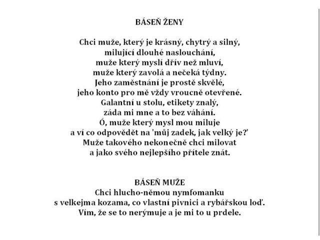 Chtěl jsem prostě vědět, jak to bude vypadat. BÁSEŇ MUŽEChci ženu, která krásná, chytrá a silná je, milující dlouhé naslouchání, ženu která myslí dřív než mluví, ženu která zavolá a nečeká týdny. Její zaměstnání je prostě skvělé, její konto je pro mne vždy vroucně otevřené. Galantní u stolu, etikety znalá, záda mi mne a to bez váhání. Ó, ženu která mysl mou miluje, a ví co odpovědět na „můj penis, jak velký je?“ Ženu takovou nekonečně chci milovat, a jako svou nejlepší přítelkyni znát.BÁSEŇ ŽENYChci hlucho-němého satyra s velkým ptákem, co vlastní pivnici a rybářskou loď. Vím, že se to nerýmuje a je mi to u prdele.