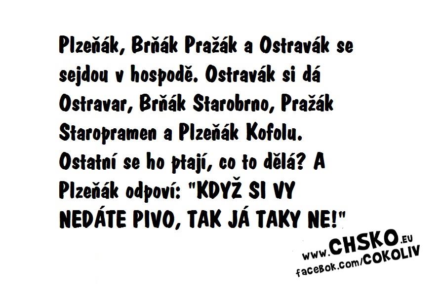 marii, ono se to dá vyložit i jinak...a to tak, že v Plzni se prostě už pitný pivo nevaří, tak mu nic jinýho než Kofola nezbyde. Btw - ať nejsem OT, tak jeden vtip (nejen pro RoFa  ): Čtyři kamarádi se už dávno dohodli, že pojedou na pořádnou pařbu pod stany. Dva dny před odjezdem najednou říká jeden z nich: "Sorry, kluci, ale manželka mě nechce pustit, tak si to užijte beze mně..." Ostatní jsou samozřejmě namíchnutí. Ale mají už všechno nakoupené, a tak se rozhodli, že jedou. Za dva dny přijedou na místo, čtvrtý kamarád už je tam, stan postavený, v ohništi hoří oheň, pivo se chladí a dřevo nachystané na celý víkend. Ptají se ho, jak je to možné, když jim říkal, že nemůže. "No, páni, včera večer si sedím na gauči, piju pivo, koukám na fotbal. Najednou se manželka přikradla, zakryla mi oči a když mě pustila, tak tam stála v průsvitném spodním prádle. Potom mě vzala do ložnice. Tam hořely svíčky, po zemi plátky růží a na posteli pouta. Řekla mi, ať ji přivážu k posteli. Když jsem to udělal, pokračovala: "Teď můžeš dělat, co jen chceš." "CHLAPI, TAK JSEM TADY..."