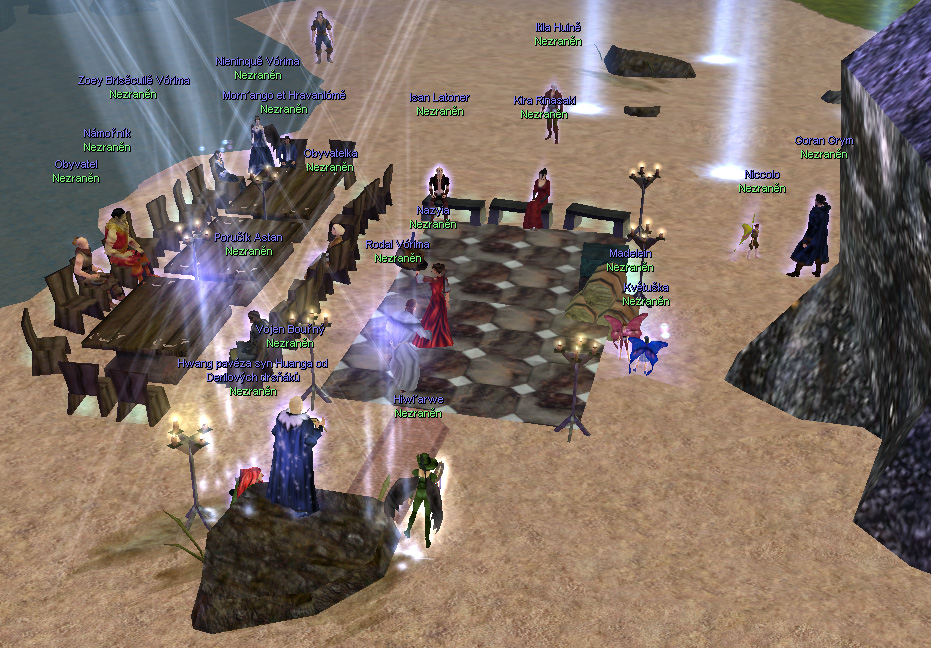 Takže přikládám vybrané fotky z večera. Goran Grym tančící s Kirou Rinasaki  Perfektně fungující obsluha kterou tak KaTo chválil  Omluva za mojí překážející hlavu, ale jinak ta asociálka nešla dobře zabrat  Taneční pár Ali a Nien (Nien vypadá trochu moc bledě protože jsem na ní měl já blb najeto myší  )  Květuška  Ali a Nien znovu, tentokrát v zajímavé taneční kreaci  Vílí tanec  Záběr na našeho umělce  Asi nejlepší screen z celého večera dle mého hodnocení  Rodal který vyzval k tanci snad všechny (a nejen ženy!)  Gandalf a trik se špičatým kloboukem  A tady trik začíná