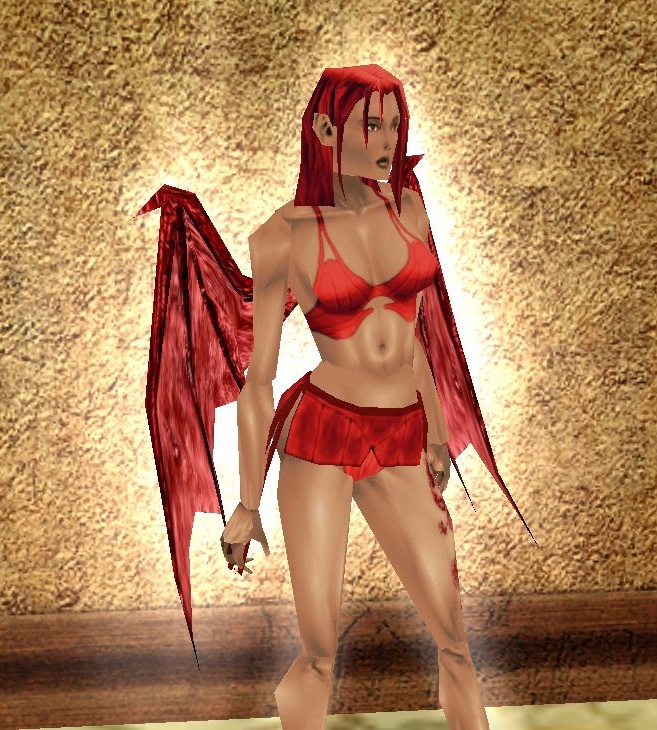 _________________ Aria Oria - pohledná divoká dívka, která ráda své skvostné tělo vystavuje jen ve skromném oblečení. Její postava nese znaky dračí krve, od rudých křídel, přes oranžové dračí oči, až po tělo hřející tak, jako by měla horečku. Měšťanka Karathy a členka Morusova stánku.