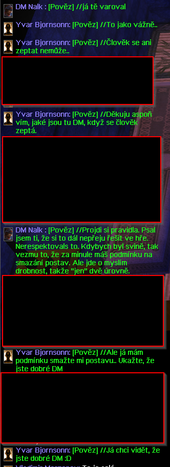 [Sat Apr 25 21:09:16] Nizar Nur Noret: [Pověz] //Obtěžování hrajících DM, WB a jiných členů týmu tellem - Hráči nemají právo po DM nebo WB po tellu něco žádat. I oni mají právo si vklidu zahrát. - viz pravidla[Sat Apr 25 21:09:40] Yvar Bjornsonn: [Pověz] Já vás nežádám c: Já se vás ptám