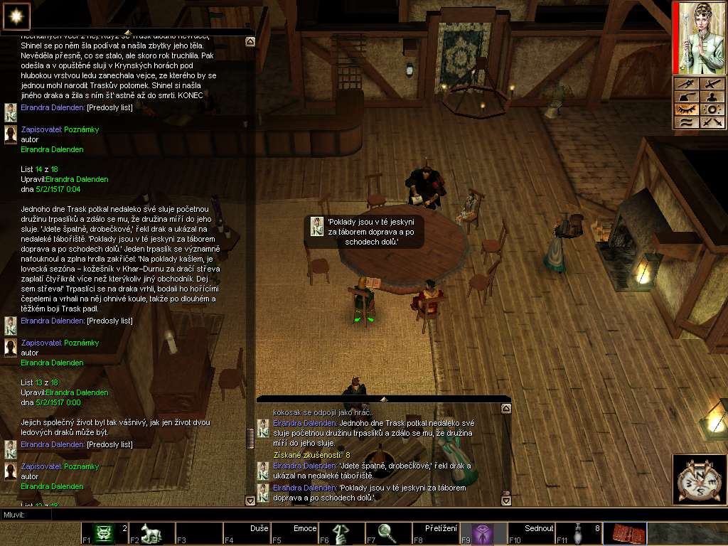 "Líbila se vám?" řekla Elandra se zvědavostí v hlase. "No.. já jen..." řekl Ali'Shah. "Moc pěkný," řekl Theureg a usmál se. "Já vás ted opustim... třeba se uvidíme večer v areně." "Trochu zvláštní příběh," poznamenala elfka. "Neměli by být trpaslíci potrestáni?" řekl Ali'Shah. "Hehe," řekl Theureg a dopil pivo. "Nashle!" "Hm... bylo by to dobré," řekla Elandra. "Ale když je lovecká sezóna... Trpaslíci jsou trpaslíci." "Mohli by se po roce třeba vrátit a být sežráni... přecijen, škoda draka," řekl Ali'Shah. "To je pravda," řekla Elandra trochu smutně, zaklapla knihu a schovala ji. "Neměli by tolik platit lovcům. Jsou pak chamtiví. "Mno jo," řekl Ali'Shah. "Eli mi kdysi v Alwarielu vyprávěla, že šla na velkého asabáka," řekla Elandra. "Prý jí za trofej dali skoro půl milionu zlatých. "Pane jo... na toho se asi moc sezona nevypisuje?" řekla elfka. Ali'Shah se napil vína. "Tolik peněz bych si poctivou prací vydělala možná za celý život," řekla Elandra. "No je to hodně," řekl Ali'Shah. "Ale asaabi.. myslel jsem, že žijí jen na poušti," řekl Ali'Shah. "Nevím, proč za ně tolik platí," řekla Elandra. "K čemu jim ty trofeje jsou? Vy o asabákovi něco víte?" "No," řekl Ali'Shah, "v poušti žije hodně asaabi... pár mil od Kelu je ve skalách jedna taková vesnice... mají i vlastní důl a takovou skalní pevnost." "A v tom dole pracují?" řekla Elandra. "No, nejsou tak přátelští, abych se jich mohl ptát," řekl Ali'Shah. "Ale někde musí brát zbraně." "Aha," řekla Elandra. "Škoda. Ale vraťme se k tématu - kdo za ty trofeje platí a proč? Vyrábějí se z nich snad ty drahé věci u Dobrodruha?" "No, loveckou sezónu vyhlašuje třeba v Karathě sir Hevair... z nějakého důvodu, nejspíš, když ty stvůry někde moc ohrožují pocestné," řekl Ali'Shah a pokrčil rameny. "To by měla být už delší dobu lovecká sezóna na Azhaela," řekla Elandra. "To tedy, ale nějak to nikomu asi nedošlo," řekl Ali'Shah. "Nebo se chtějí zbavit neomalených dobrodruhů a doufají, že se o to postarají tito tvorové," řekla elfka a mrkla. "Hm... to je možné, ale ti, kdo ohrožují pocestné, by je měli zajímat víc," řekla Elandra. "To tedy," řekl Ali'Shah.