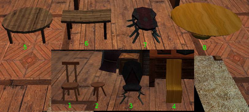 Modely č. 4 a 8 jediné vyžadují HAKy a byly by k dostání pouze v Alwarielu, modely č. 3 a 7 by byly k dostání pouze v Podtemnu. Na stolech, pokud budou nakonec implementovány, pochopitelně nepůjde sedět, ale půjde je otáčet. Scriptování craftu si rád vyzkouším.