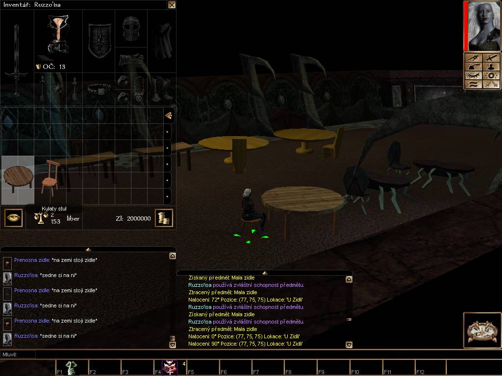 EDIT: Jinak ta má připomínka byla myšlena spíš v nadsázce, židlovej val mi přišel vtipnej. Jinak jsem za sebe hlasoval za možnost "pro", protože jednoduše nevidím důvod, proč něco, co hru rozšiřuje, a co navíc někdo dobrovolně naskriptuje, jen tak smést ze stolu. Jasně, že jde udělat průchozí židle. To aby nějaký placeable byl aktivní nemusí nutně znamenat že je neprůchozí, k tomuaby postava sedla ti stačí uplně stejný placeable jako třeba vykopaná díra do země kterou vidíš kdykoliv použiješ ve hře lopatu. to že kolem sebe bude mít texturu židle s tím nemá co dělat. Ve hře máš například stany, deky, nebo jakýkoliv předmět který někam vybalíš z inventáře. Tyhle předměty jsou normálně průchozí a přesto jsou klikatelné, co se stane pokud na takový objekt klikneš už řeší script. Nevím jak vytváří židle Elandra, dělat to já, použil bych stejné scripty jako pro umistitelné objekty z inventáře, pouze možnost která se spouští po kliknutí na ně na zemi bych obdařil rozhovorem s možnostmi: 1. sklidit židli do batohu 2. posadit se 3. nedělat nic (je zbytečný, rozhovor se dá zrušit i jinak, ale jsou puntičkáři, kteří by peskovali nemít tam tuhle možnost) Po kliknutí na židli se už ve stávající verzi ukáže rozhovor. Kromě uvedených tří možností tam bude ještě možnost vyvolat rozhovor na změnu natočení židle v prostoru a možná i zobrazit pozici židle v rámci lokace (když tam tu židli někdo bude chtít na trvalo, pošle WB přímo čísla a nebude muset zdlouhavě popisovat, kde že to je). Pro vyvolání židle bude použit jiný skript než pro deky, stany apod., protože umístitelné objekty z inventáře se umísťují k postavě, zatímco židle se budou umísťovat na místo, kam uživatel klikne na zem. Elandra židle nevytváří, není dřevař, tesař, truhlář, židlař ani nic podobného. Elandra si je normálně půjčí.