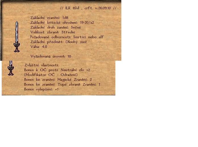 Level kováře 5, výroba krátkého meče ze železa s ořechovou násadou, maximum 120% železa - výsledný krátký železný meč s ořechovou násadou, bonus vylepšení +1, snížené OČ -1 Attachment: