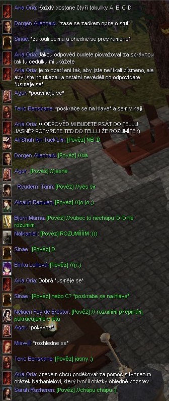 kokosak wrote: Mě teda totálně uzemnily všechny ty lehké pohyby rtů, uhrančivé pohledy a lesky v očích, které mi i přes půl mapy připomněly červenou knihovnu (řekl bych Twilight, ale ten znám naštěstí jen z doslechu). Také hodnoceno spoluhráčem jako "onanie nad svou úžasností". Fakt sem se musel chlámat, jen houšť, jen houšť!  A samo některý možnosti odpovědí na soutěži byly epický - třeba opálené nymfomanky  Třeba dělat otázky a odpovědi trošku odlehčené at se lidi pobaví  Jinak mě dostalo tohle  Při vysvělování pravidel soutěže (obrázek viz nižejc)