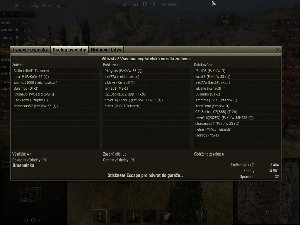 Získaný titul spojenec, válečník a průzkumník zaráz:) Klobouk dolů  , zaplnit všechny tři sloupce, to není jen tak (dvojka nedvojka). Btw. Měl jsem možnost si tu jejich "mašinku" prohlédnout v akci (i když jen tréninkově) a měním její označení na "malou bestii". Je to celkem svižný (stíhalo to docela v pohodě zaměřovat i M7), kadence střelby je taky víc než dobrá (poškození nic moc, ale ve své třídě to musí pěkně šrotovat), je vidět, že se do něj i posádky nemálo investovalo. Ad Nový patch: Co vidím jako velmi pozitivní, je informace, že většina majitelů těžkých ruských tanků, si díky změnám v jejich stromu přijde i na nové místo v garáži zdarma (a konečně si vrátím do výzbroje takový skvost jako je T1 Cunningham  ).