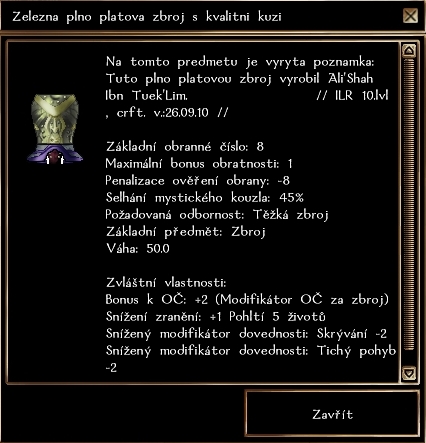 zároveň při 200% železe + kvalitní kůži = +2 OČ za zbroj, není tam to pitomé OČ proti sekání. Minimální lvl 10 (a to je tam lepší kůže a technicky vzato zbylých 20% tvoří i lepší kov). Attachment: