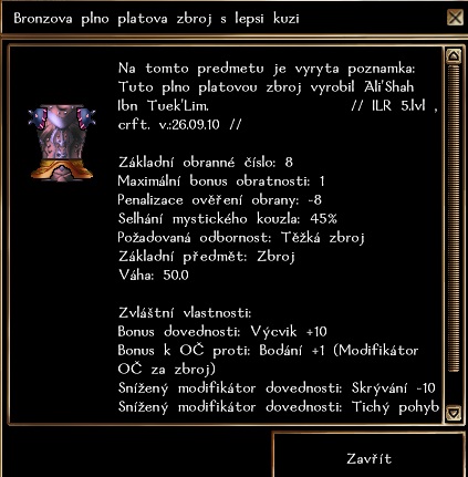 180/20 (železo bronz, lepší kůže) +1ac, +2ac bodaní, +1 výcvik, pohlcení +1/5 - 11lvl