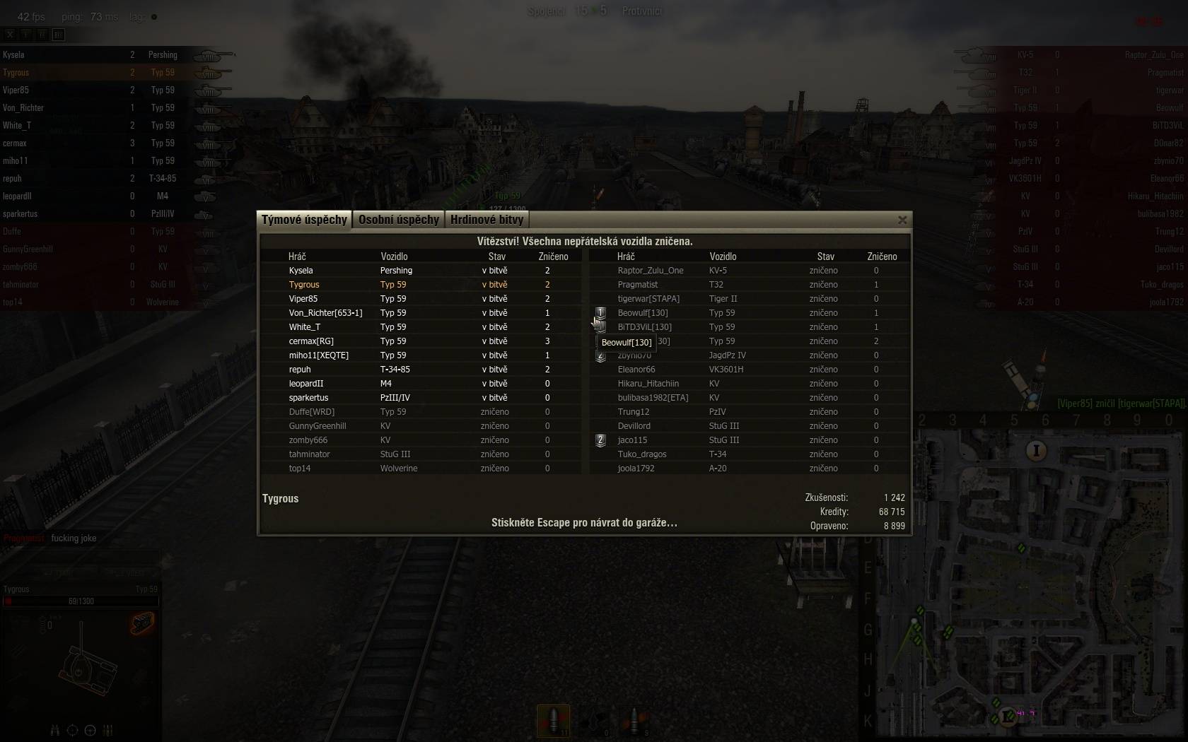Tak z toho uvolnění Typu59 vůbec nadšený nejsem a ten postnutý obrázek, to je tragédie a zrůdnost systému balancování hry v jednom (i když jsem teda viděl kdysi i horší, kde jedna strana měla těch typů snad kolem deseti). Naštěstí bitvy, kde by jedna strana měla těch typů více než tři čtyři, zažívám opravdu jen ojediněle.