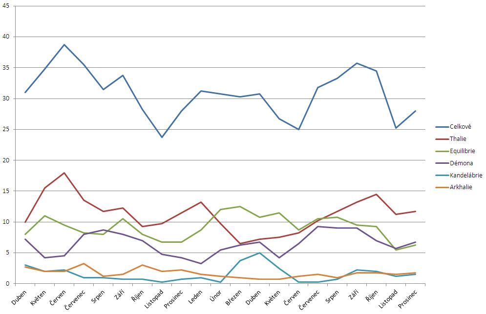 Zase nějaké orientační statistiky  Přidán listopad a prosinec. Zajimavý je pokles v listopadu, stejně tak to bylo minulý rok. Takže v červnu bdue další? To sou ty zkoušky a zápočty co?