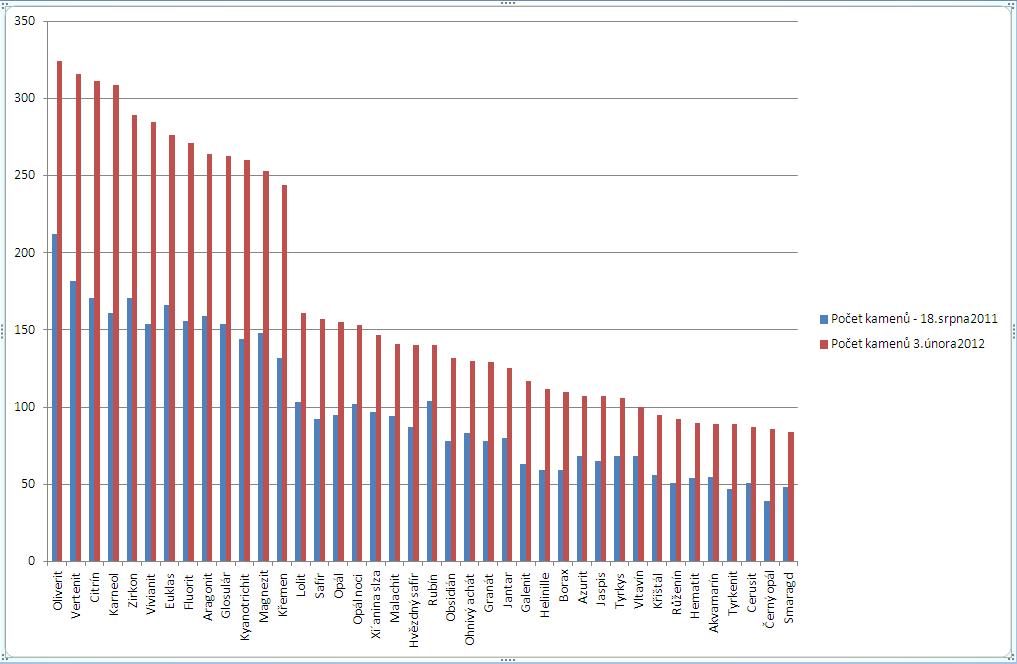 Dlouho tu nebyly žádné grafy  Tak něco z Ariina obchodu 1. Porovnání počtu jednotlivých druhů kamenů mezi dvěma datumama. 18. srpna celkem 4054kamenů, 3.února 6846 kamenů. 2. Porovnání kruhů svitků, celkem 2669 svitků  .