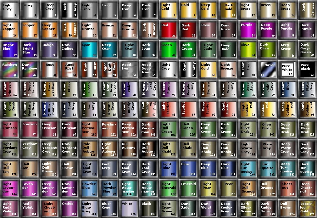 Pro doupravení vzhledu postavy lze v úvodních lokacích užít příkazu na změnu barvy vlasů, kůže a tetování (oči a rty). Zde jsou kdyžtak tabulky: