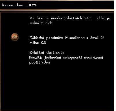 Tohle sem nejspíše docela nepatří, ale stalo se vám to někomu někdy? Ty kameny dole na obrázku jsou jakoby s chycenou duší, ale není uvedeno kolik procent. Také nejdou použít pro očarování zbraně. Nejspíš je to moje chyba, asi moje postavička nemá na chytání pro tento kámen dostatečný levl, ale stává se mi, že se mi při chytání objeví hláška typu:"zaměřená duše je pro tento kámen příliš malá" nebo že naopak je moc velká, nebo je příliš těžké ji chytit a kámen praskne. Ale případ na obrázku je jiný a přijde mi to divné. Je to jen náhoda, nebo moje chyba? Attachment: