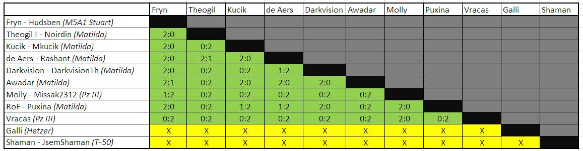 VysvětlivkaV tabulce výsledků patří první číslo vždy hráči, který je v levém sloupci a druhé čislo patří hráči, který je v horním sloupci. Viz naznačení výsledku Kucik vs Fryn - 2:0 Attachment: