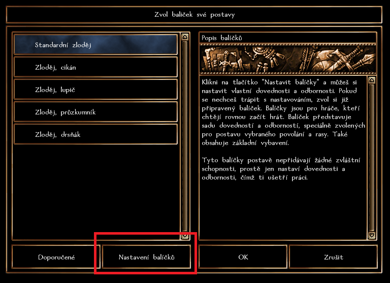 5) Dovednosti a odbornosti:Zvažte také velmi pečlivě, jakými schopnostmi bude vaše postava oplývat. Velký díl na tom samozřejmě má výběr povolání, který určuje okruh odborností a dovedností, kterým se je schopna naučit (popřípadě naučit lépe než ostatní). Rozhodnutí o tom, které z nabízených okruhů váš charakter využije, je ale čistě na vás. V zásadě platí, že některé dovednosti jsou pro hru téměř nezbytné, bez jiných se obejdete, ale mohou vám zjednodušit hru a postavě život a konečně jsou i takové, kterých využijete jen zřídkakdy a volí si je tedy povětšinou jen postavy, které mají rozdělitelných bodů nazbyt. U odborností je pak volba správná volba ještě zásadnější, protože velká část z těch nejsilnějších má za podmínku některou z odborností základních. Proto se nebojte ptát zkušenějších, jestli neděláte při výběru chybu nebo nahlédněte do rad a doporučení, které jsou popsány v této sekci. Důležitá upozornění:- V žádném případě nevybírejte jeden z přednastavených balíčků dovedností a odborností (např. standardní zloděj, lupič, atd.), ale použijte tlačítko "Nastavení balíčků". Dále pokračujte podle následujících bodů níže.