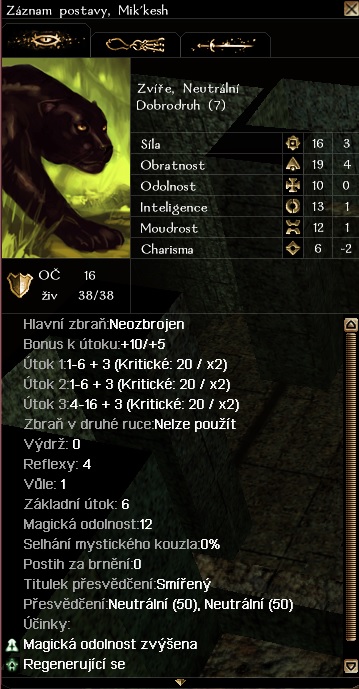 Quote: Vylepšení přítelíčků: +1 AC za 2 lvly sesílatele +1 vylepšení zbraně bytosti za 6 lvlů sesílatele (tzn. třeba imp od 36. úrovně sesílatele bude mít vylepšení pro účely snížené zranitelnosti +6) +1 regeneraci za 5 lvlů sesílatele +2 ab za 5 lvlů sesílatele +1 do všech záchraných hodů za 5 lvlů sesílatele Jsem wizard lvl.6 a můj panteří přítelíček (lvl7): Neregeneruje - tedy zkouší to ale vy výpisu se zobzuje že byl léčen za "0" HP. Neobdržel +1 vylepšení zbraně - zelený hlen je zranitelný pouze +1 zbraní a lepší, familiarovy útoky psaly "zbraň je neučinná" Nedostal bonus do sejvů a AC - můj familiar je na 7. lelvu a vypadá pořád stejně jako na 1.levlu. Tedy AC 16, sejvy Výdrž:0, Reflex:4, Vůle:1 (dle wiki je na tom vlastně ještě hůře, má mít sejvy na 1ním levlu: Výdrž:0, Reflex:7, Vůle:1) Pohlcení má, AB netuším jak má fungovat, jestli klasická progrese která ej pro každýho familiara jiná + 2AB za 5caster levlů? Nebo jestli jen základ co dostanu na prvním levlu a k tomu + 2AB za 5caster levlů?